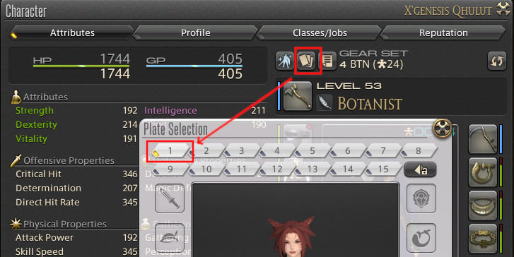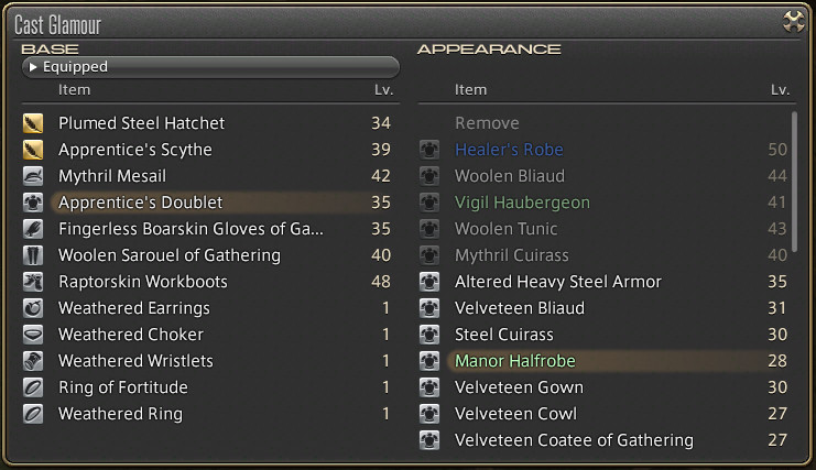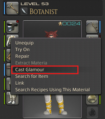 Once you have items in your dresser you can make up to 15 “glamour plates” which are sets of gear. Click on one of the set buttons, and then choose an appropriate item from the dresser to go into that set. If an X appears on the icon it means that the glamour can’t be applied to your current job.