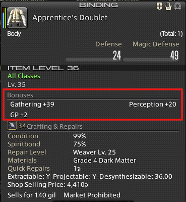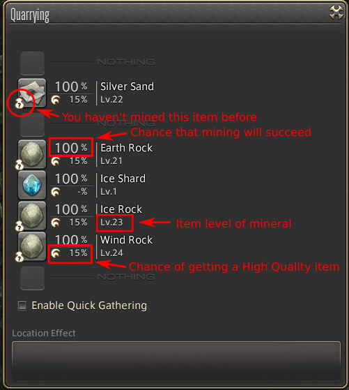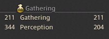 Gathering points improve your chance of mining something. Perception improves your chance of getting a HQ item. Also Perception increases your chance you will “see” an item. With low Perception you might be in an area which is supposed to have a certain ore, but it won’t show up on the list of ores in a node. Get some gear with +gathering and/or +perception to help with that.