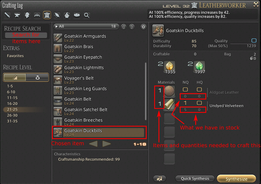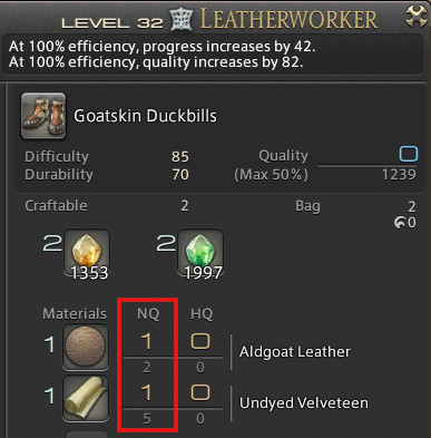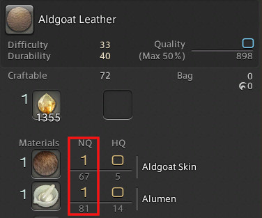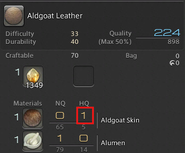 If I didn’t have the skin or alumen I would have to go into the field and kill some goats for their skin, and mine some nodes for the alumen … or go to the Market Board and buy them. You may want to use the Database to find where the mobs are that drop things like skin.