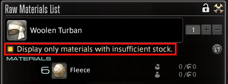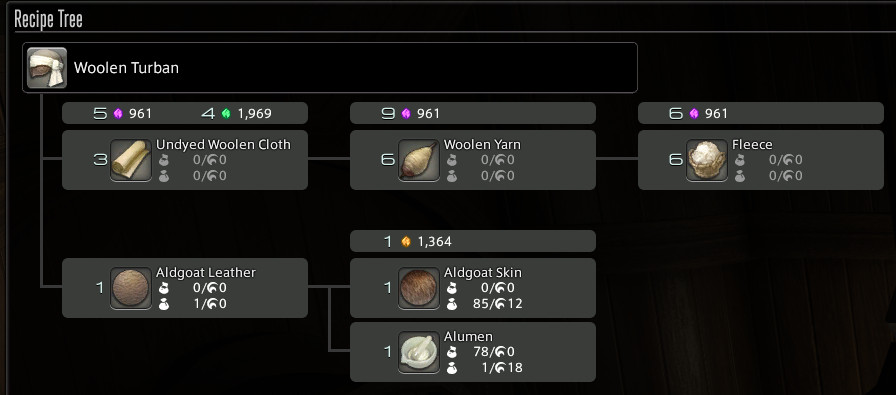 A handy feature of the Crafting Log is the ability to view the recipe tree (RH-click on the item that you wish to make). For example, if I wanted to make a Woolen Turban, the recipe tree tells me the primary ingredients (on the left) and then to the right the ingredients of the ingredients, and so on. It also shows next to each one how many I have in my inventory (top count) and how many my retainers hold (bottom count). That way I can work out what primary ingredients I either need to find in the field, or buy at the Market Board.