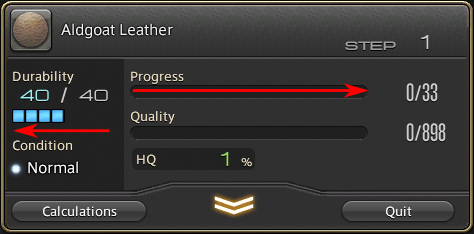 You can click on Calculations to see what sort of figures are involved. As predicted, one click of Basic Synthesis increased my progress by 50 (out of 85 in this case) and my durability has gone down by 10. Most actions reduce durability by 10.